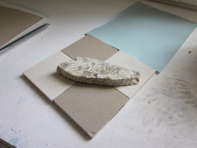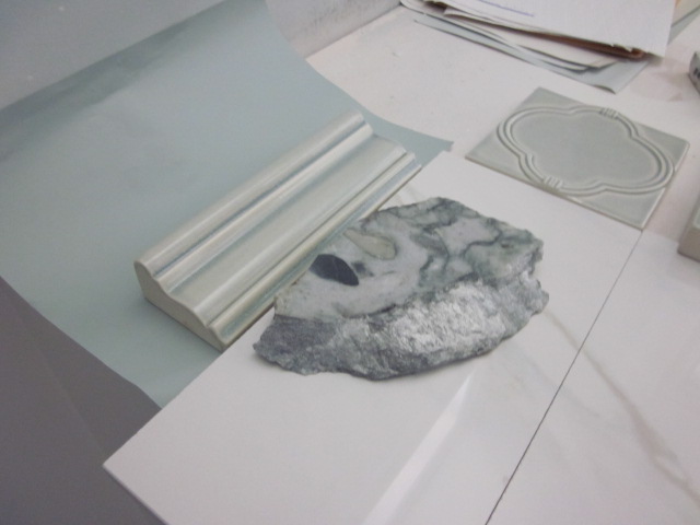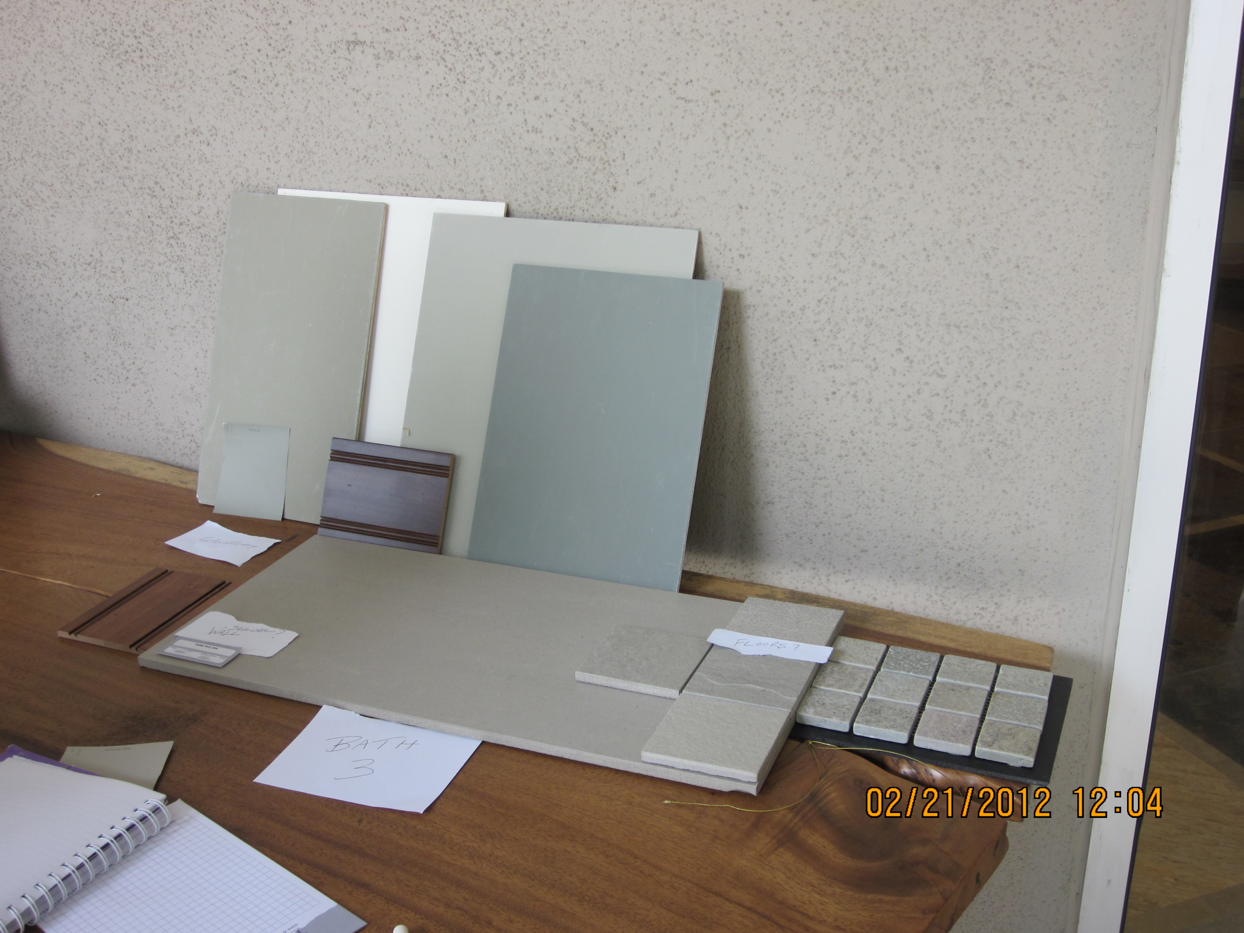 A photo showing our tile selection with a possible granite choice. We did not use this unusual granite selection for this bath, but we did choose to use it in another room.
