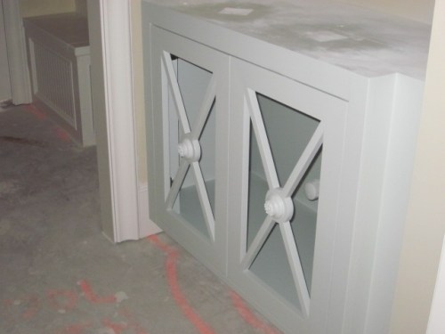 It’s hard to tell from this photo, but this bathroom cabinet is painted a light blue color . The X’s including the center molding piece will be glazed with a silver hi-lite to accent the exquisite details. I plan on putting antique mirrored glass in the door panels.