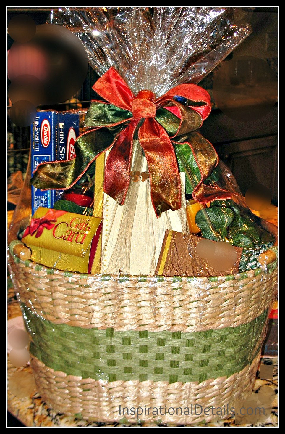 “That’s Amore”…We took a gift card to an Italian restaurant and added various Italian-type food items to this basket lined with a red and white fabric