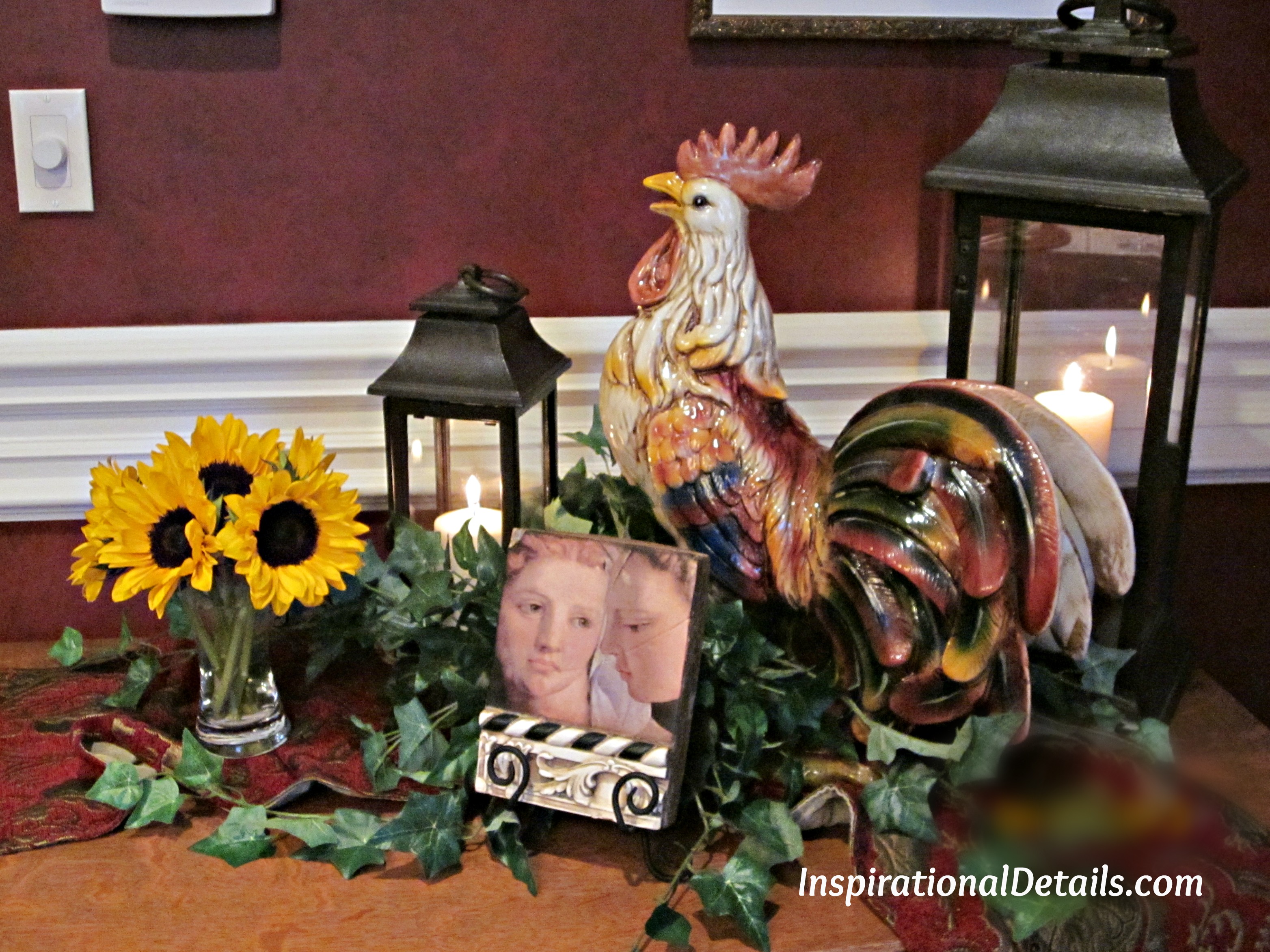 A side chest in the dining room decorated to coordinate with the Italian theme