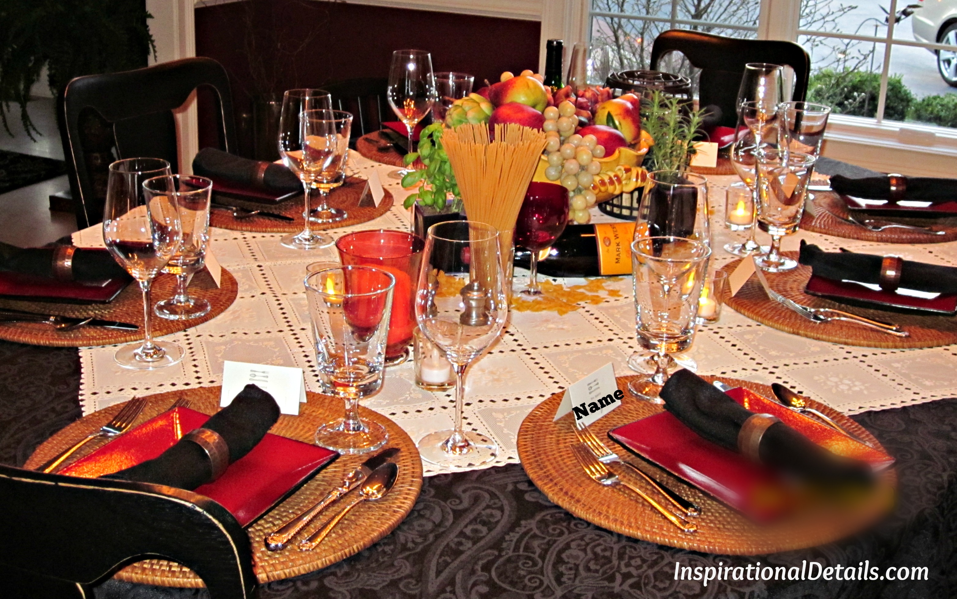 Another couple in our Gourmet Group hosted an “Italian Dinner” night at their house. Here’s a look at the beautiful Italian-themed tablescape she put together.