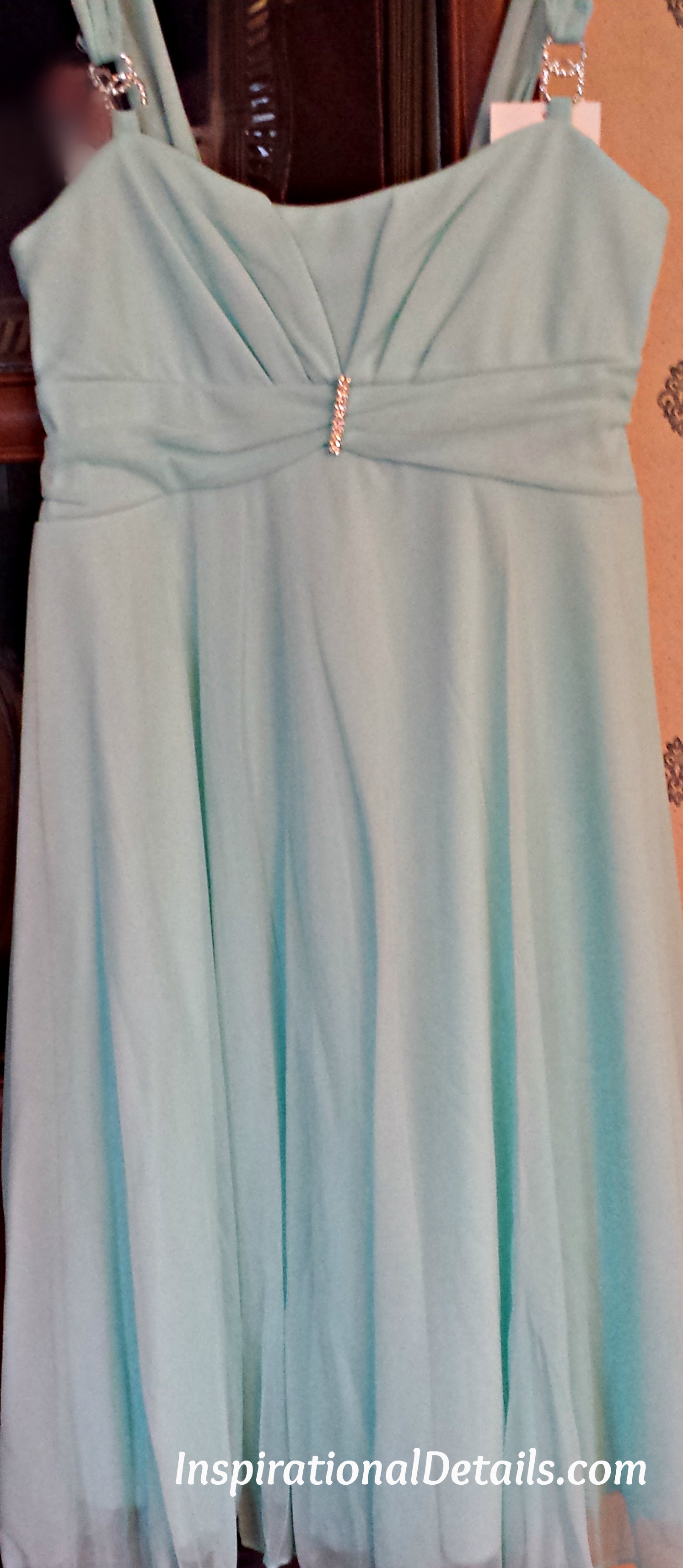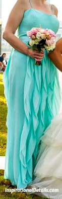 Ultimately, the girls chose an aqua (Tiffany blue) for their dress color. The dresses were designed by Wtoo (Watters). The girls could choose any Wtoo dress as long as it was in a long length and made in a crystal chiffon fabric. They also would wear any silver sandals/shoes of their choosing.