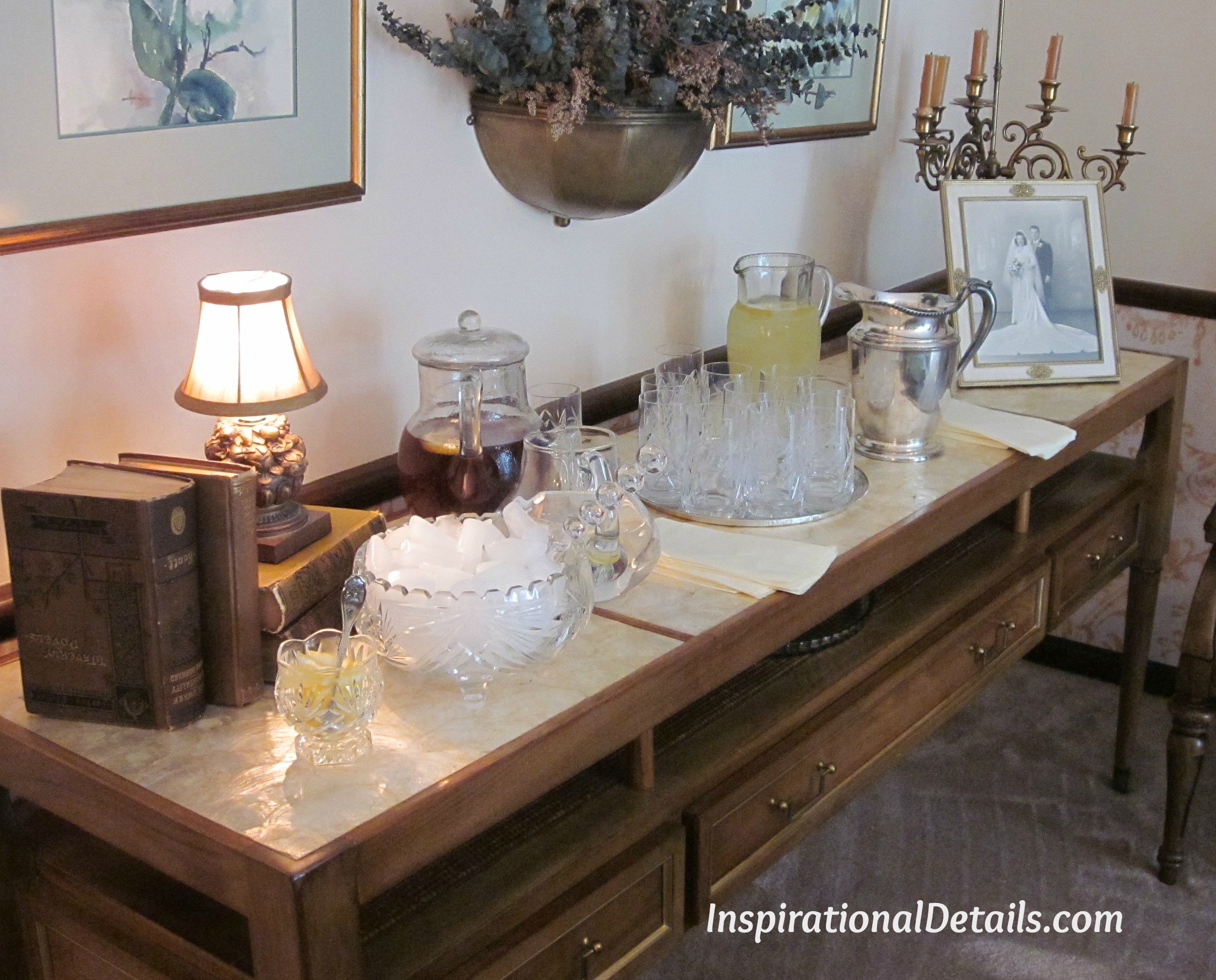 The sideboard held all sorts of refreshments for us to drink except for the (hot) tea which was on a separate serving piece (no photo).