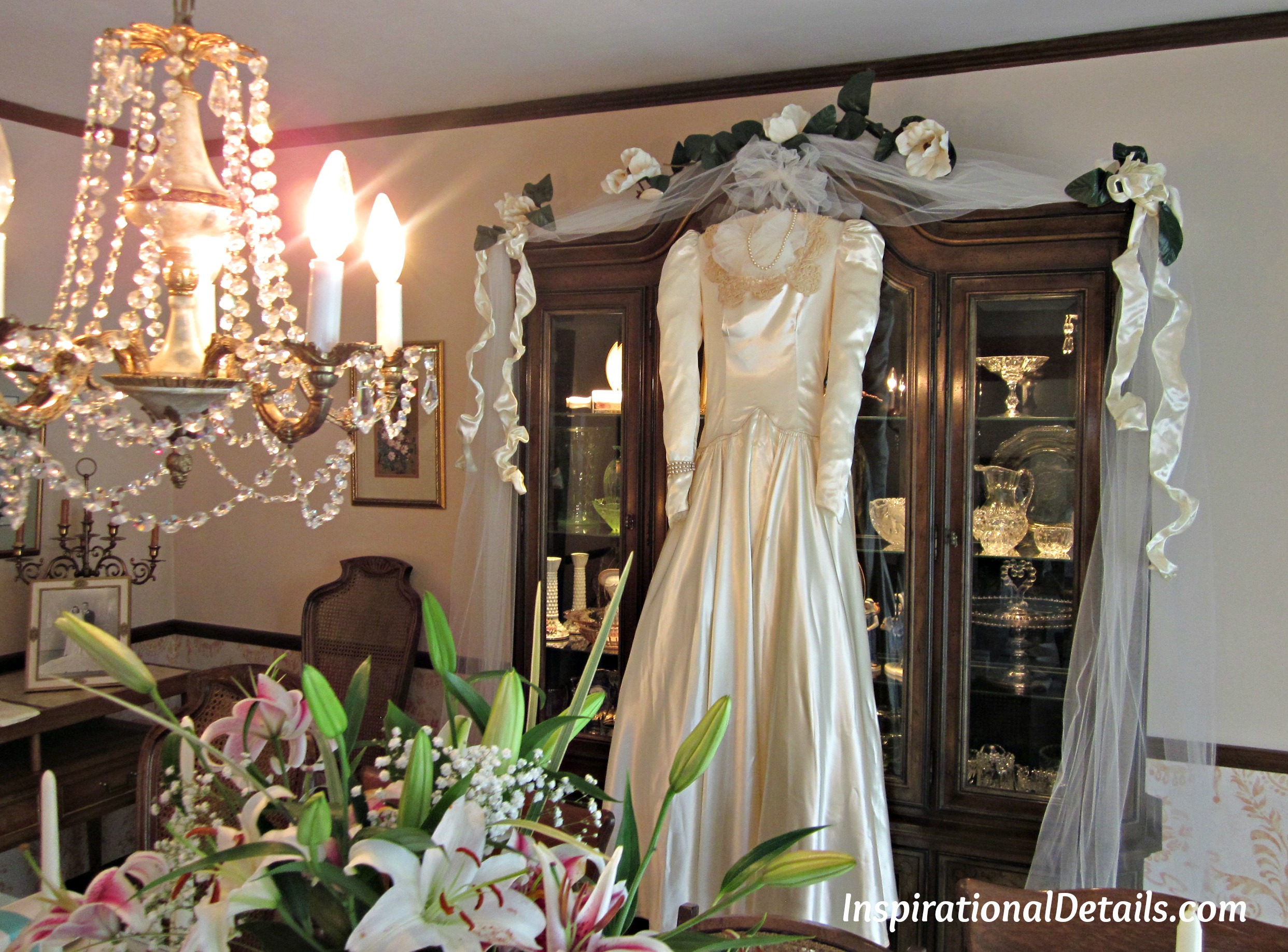 My sister-in-law took the dress out of storage, carefully ironed it, and stuffed the dress with tissue paper to give it presence. If you look closely, you can see she added a pearl necklace and a pearl bracelet to the dress just like my mother wore on her wedding day. It truly was a Wow!
