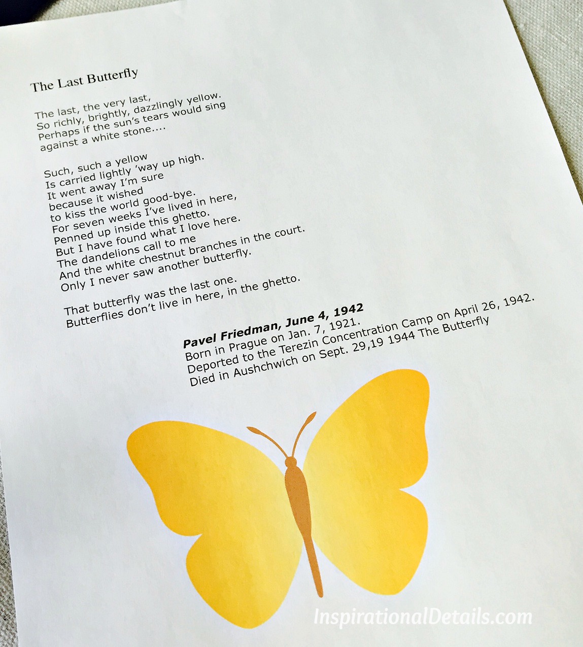 Each place setting included a copy of this poem, The Butterfly, written by Pavel Friedman. As you can see, Friedman sadly died while in a German concentration camp.