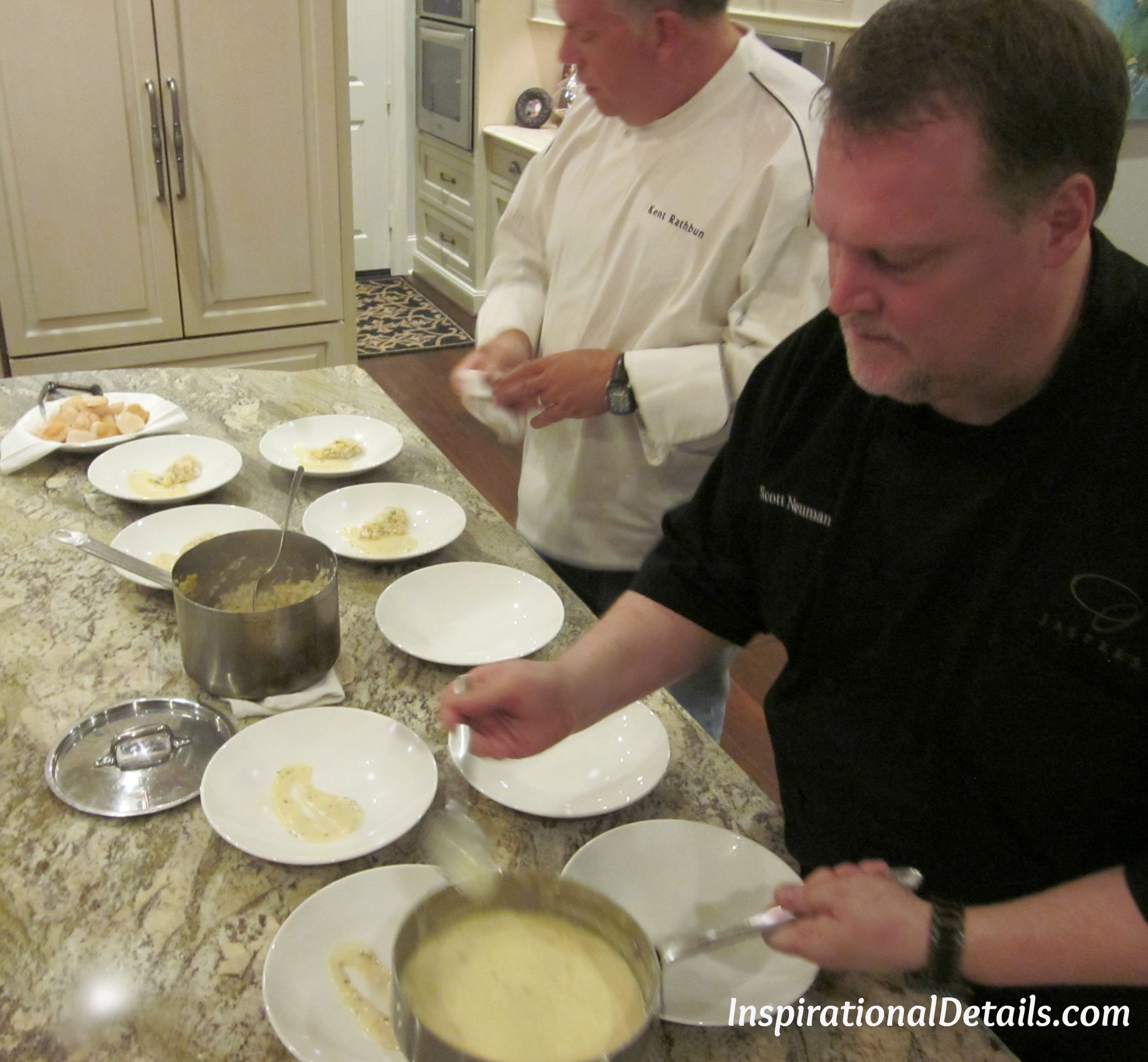 Chef Scott continues with the sauce, while Chef Kent starts plating the risotto