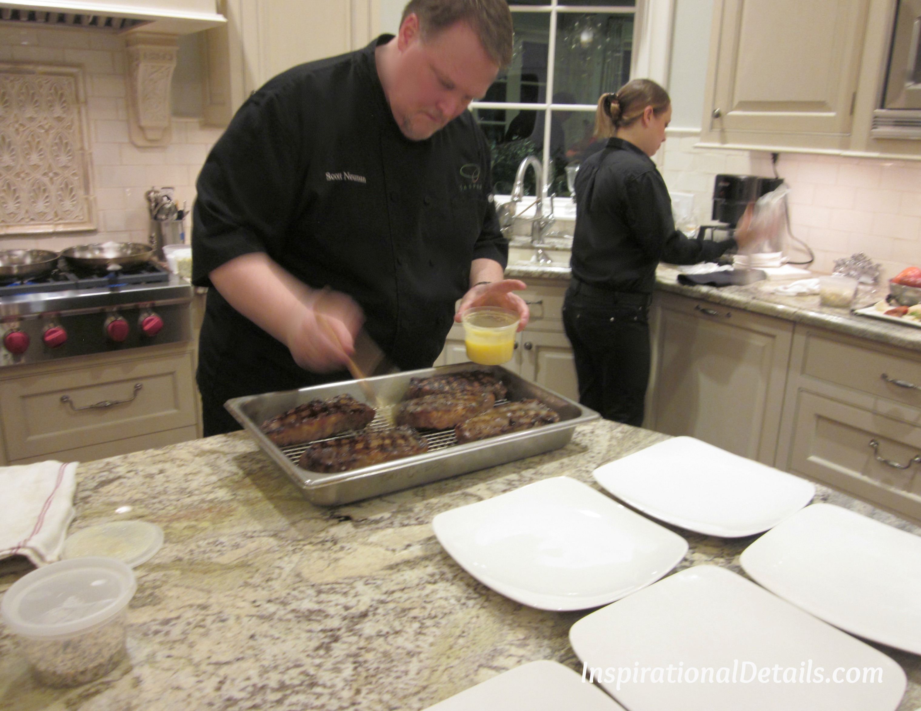 Chef Scott bastes the steaks before heating them on the stove. The steaks had been partially pre-cooked earlier at Jaspers on the grill with hickory chips.