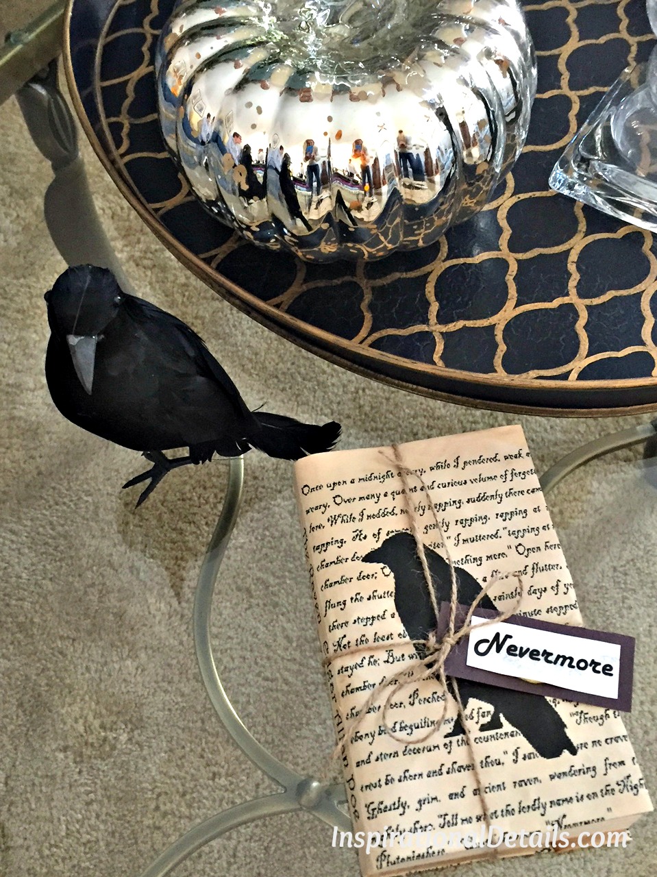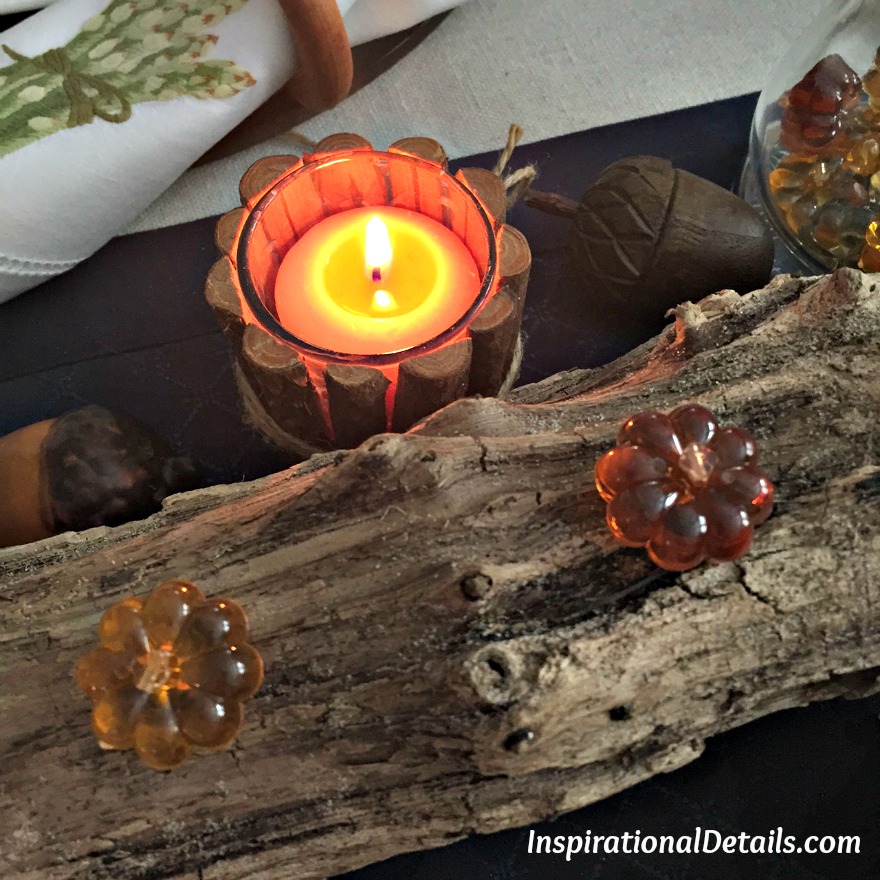 The orange-colored pumpkin-shaped beads on top of the driftwood are actually vase filler beads just sitting on the wood (clever!). Her pretty napkins are from a past trip to France.