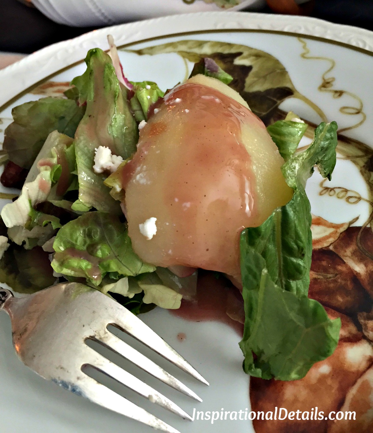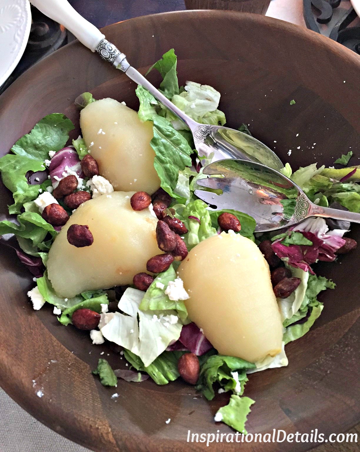 Mixed greens salad with feta cheese, raspberry glazed almonds, and canned pears served with a raspberry dressing…