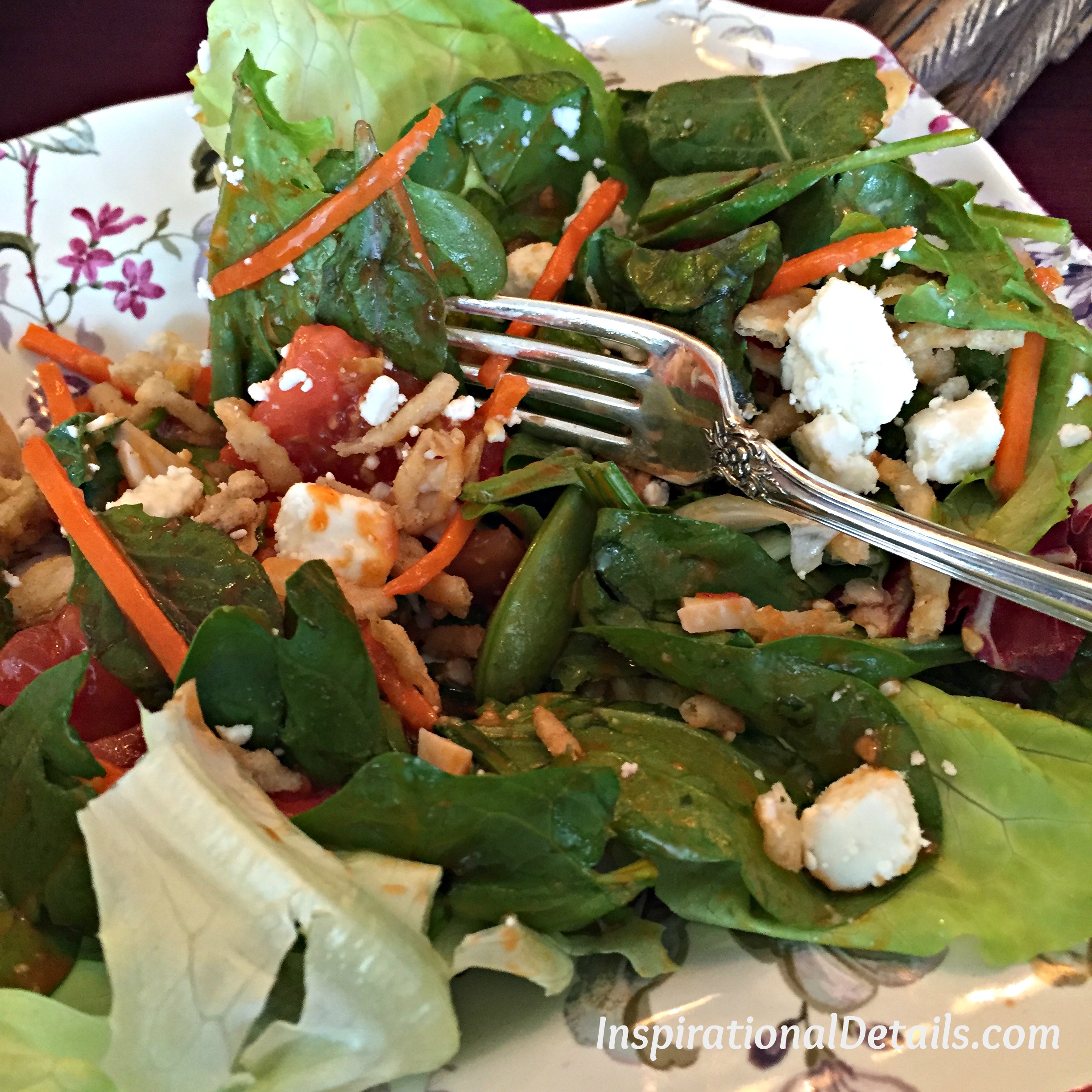 All kinds of goodies in the salad like cheese, tomatoes, pea pods, tomatoes, and French fried onions served with a French dressing…