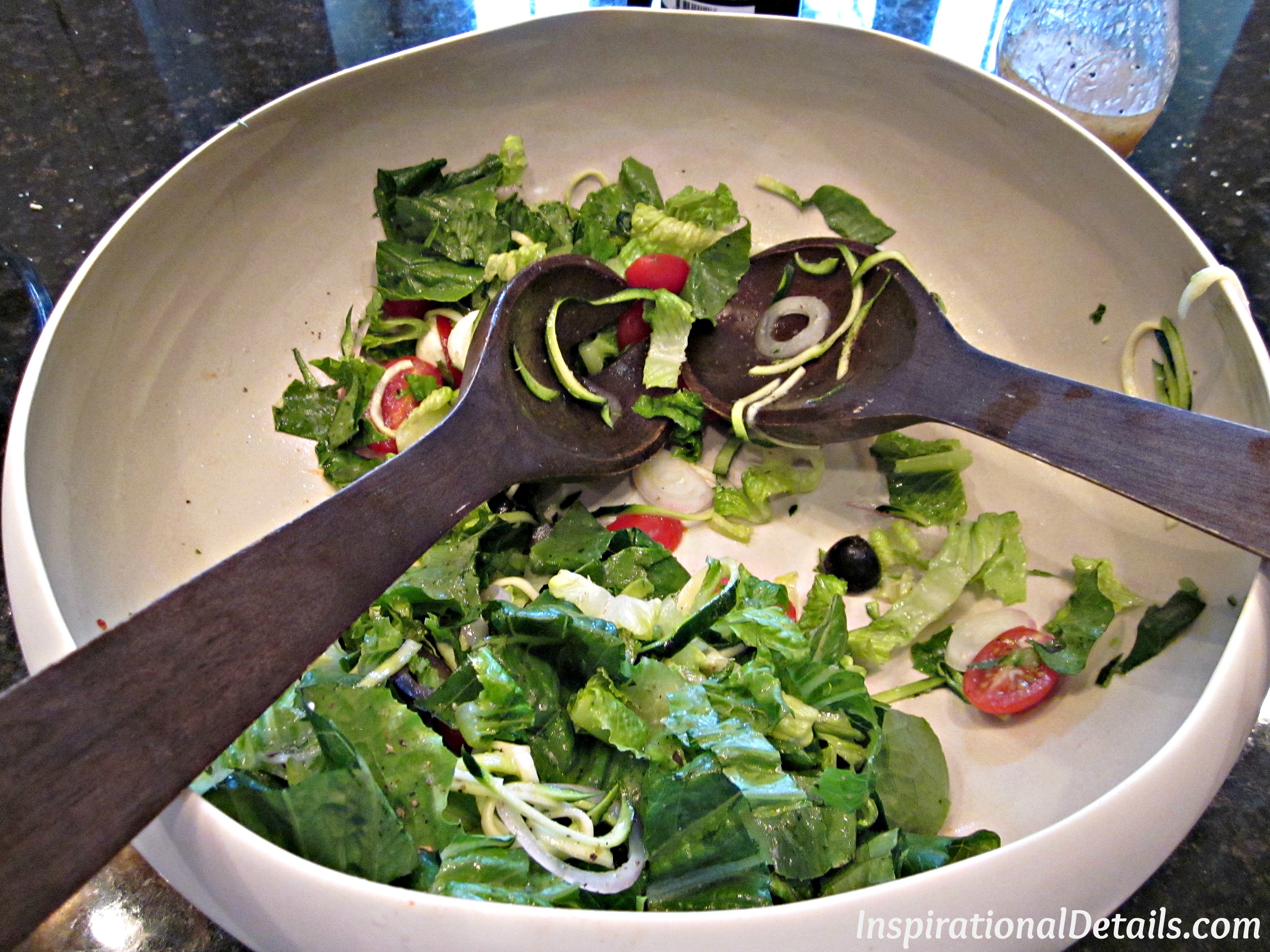 A delicious salad with mozzarella, tomatoes, onions, black olives, and spiralized zucchini served with Zesty Italian dressing…