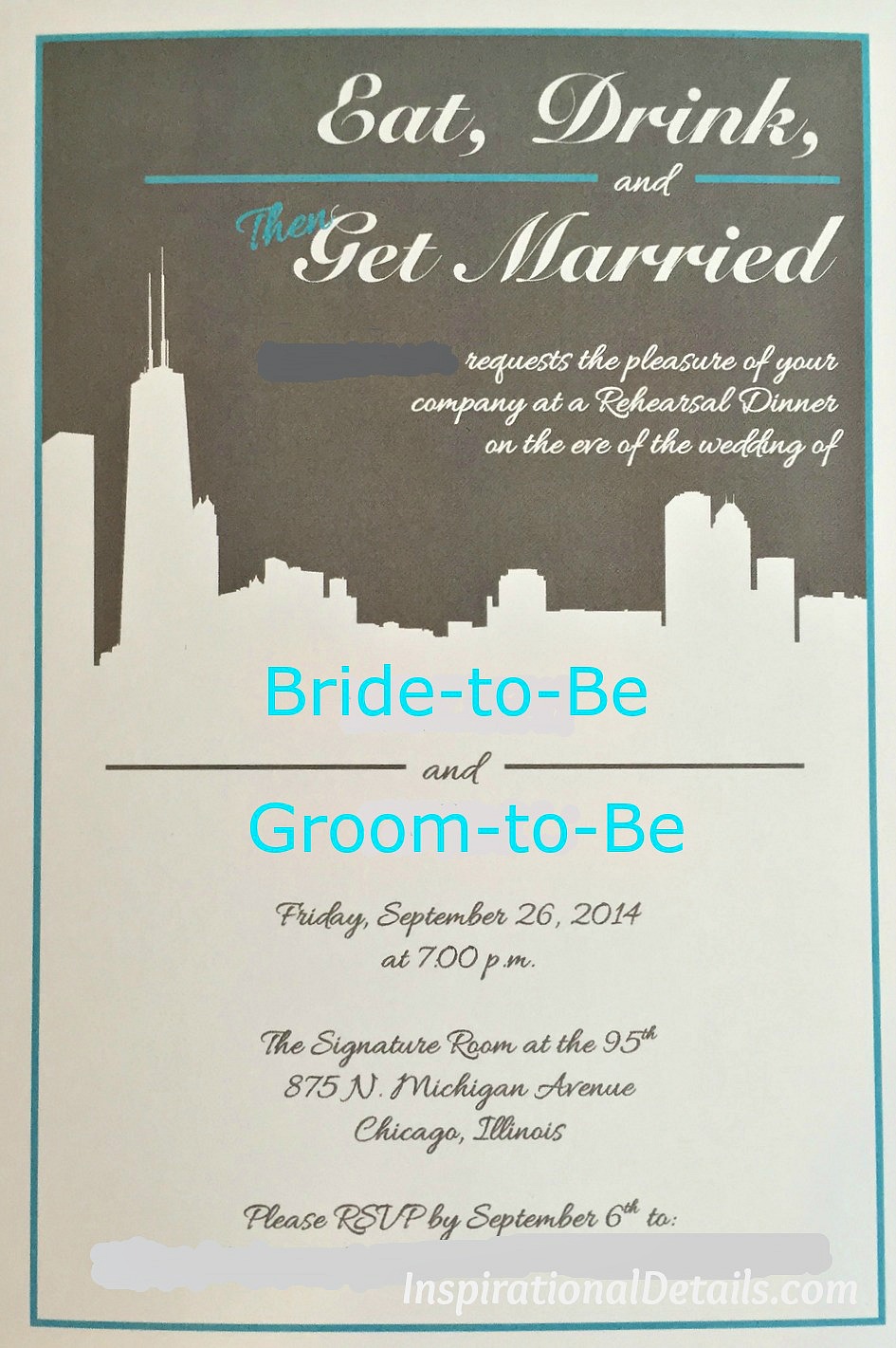 Invitations to the Rehearsal Dinner were mailed out. The engaged couple decided to keep with their previous “Save the Date” theme of the Chicago skyline invitation.