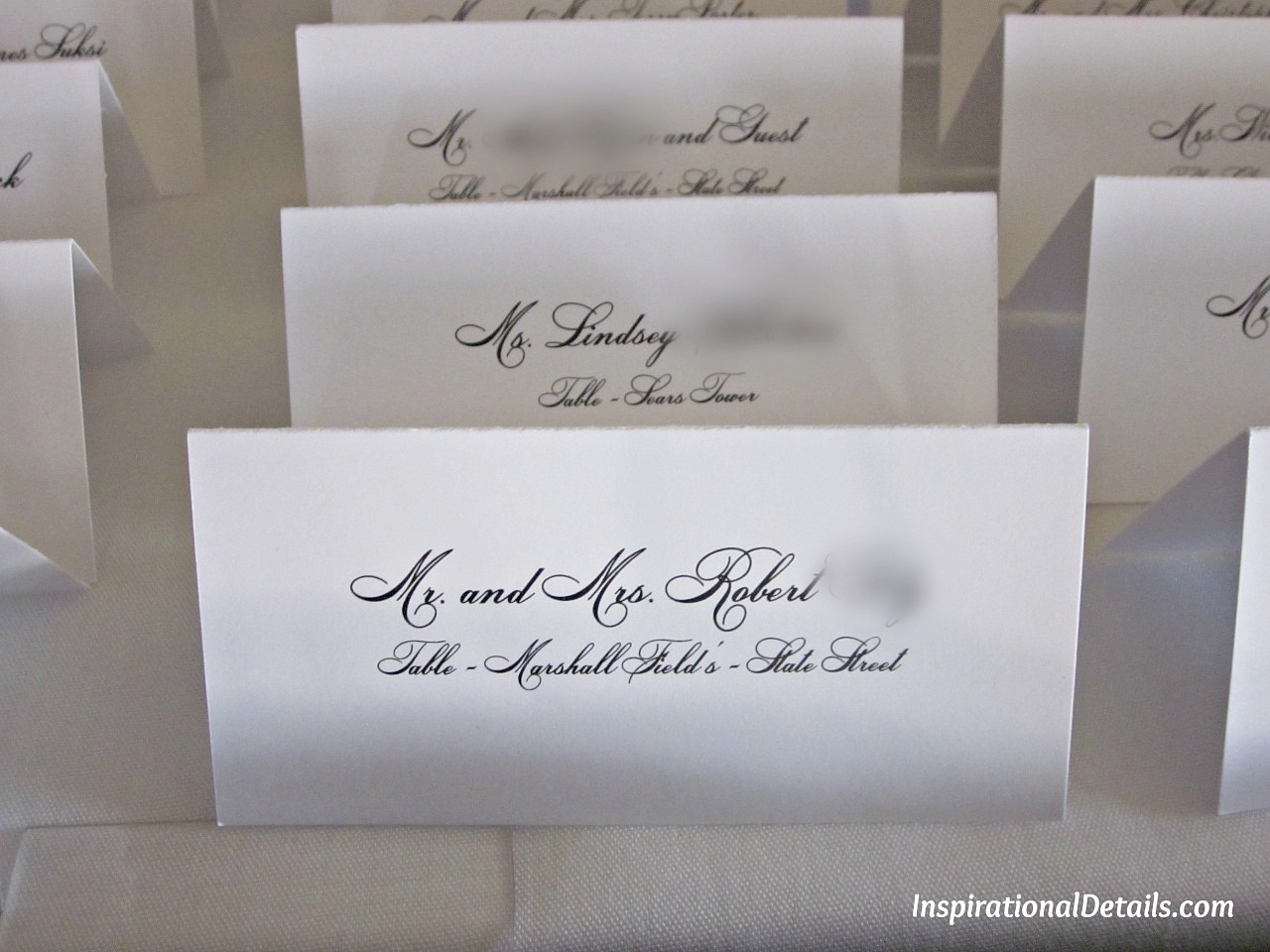 I tried to use an unusual or interesting photo from each landmark to make it more fun/difficult for the out-of-towners to figure out which table was theirs. I used photos like the historic clock for Marshall Fields and the glass viewing ledge for the Sears Tower. Photos were then glued on to both sides of a white tented card.