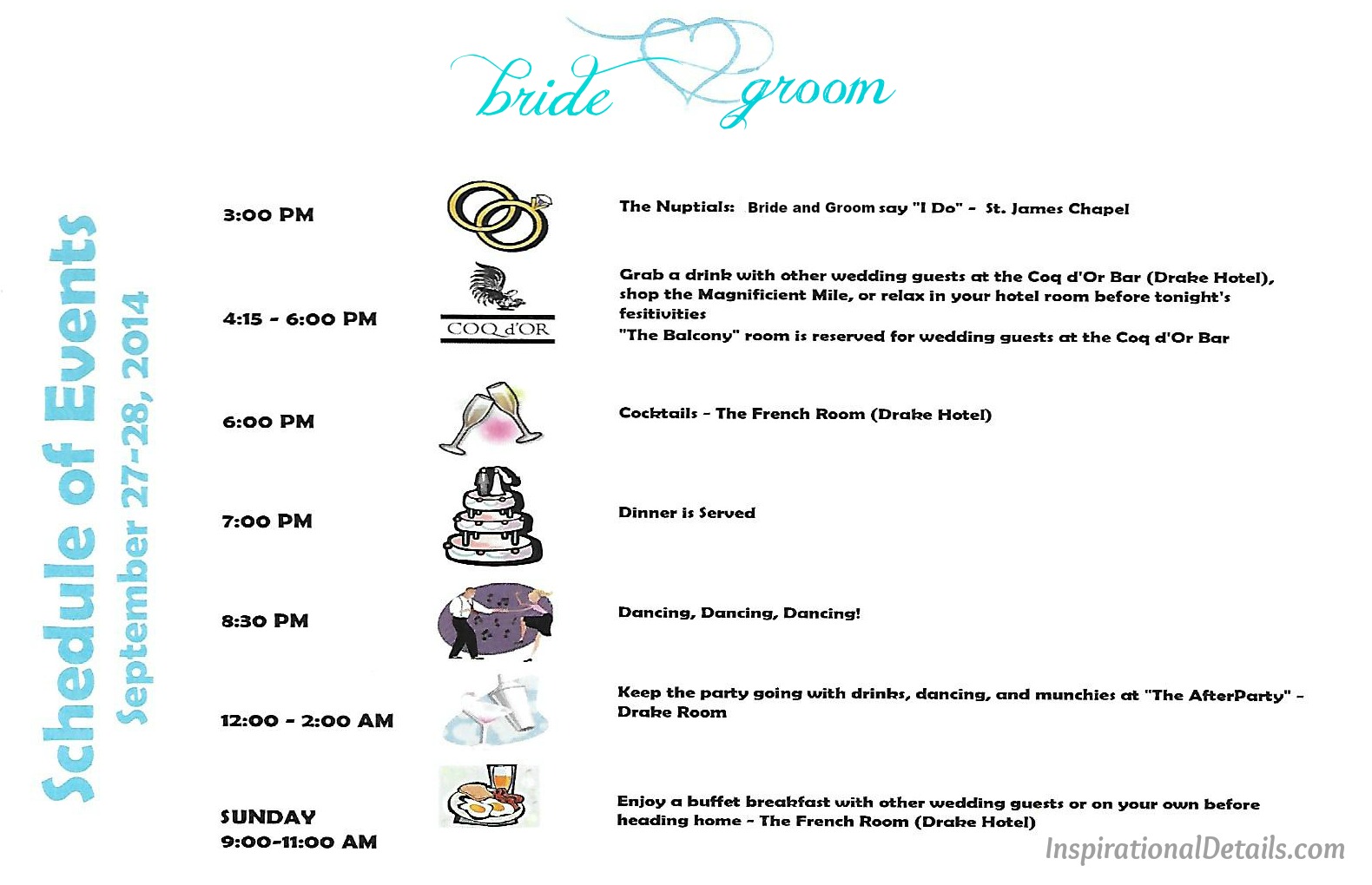The map continued with the couple’s “Eat, Drink, & Be Married” Theme – with some restaurants and bars marked, and of course, the all-important locations of the wedding ceremony (St. James Chapel) & the reception (The Drake Hotel).
