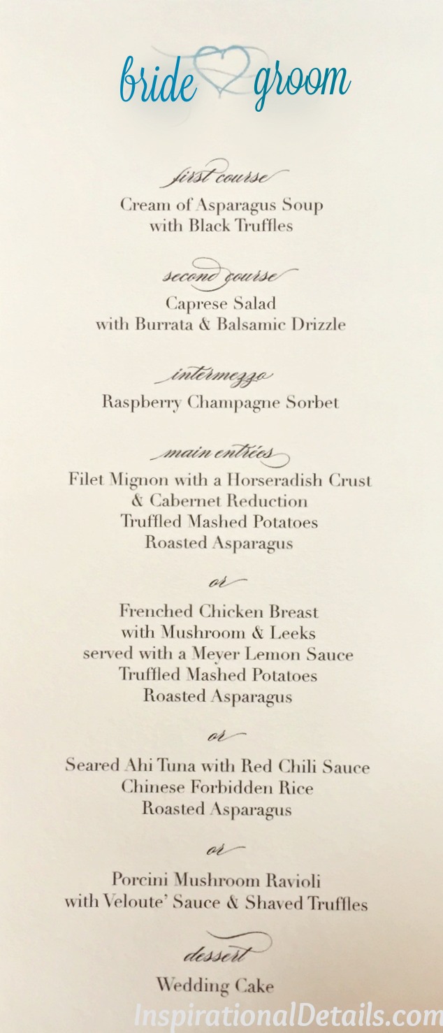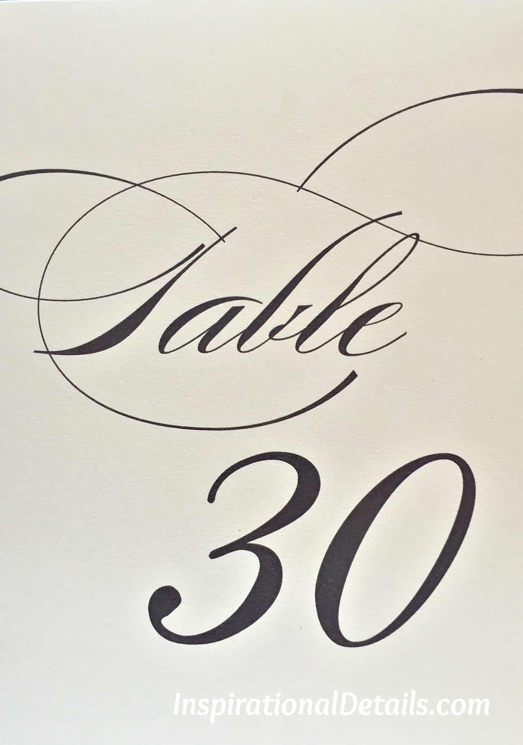 Both my daughter and I spent a lot of time and energy researching/looking at various table number ideas. We wanted something stylish, easily visible to our guests, and that fit with the overall look we were going after. My daughter even attempted a DIY version of “silver glittered (wooden) numbers”. Ultimately, we decided on “Tented Table Numbers”. We picked out a beautiful font, and had them printed up showing table numbers on both sides of the tent. The Table Numbers were simple but elegant.