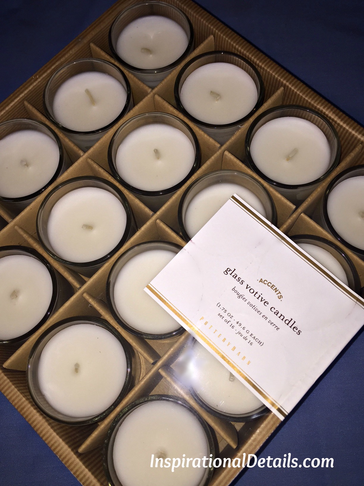The Drake provided 3 small votives for each dinner table. That was not enough for me, plus I knew the burning capacity of each of the votives was 2-3 hours at best. I envisioned lots of candlelight in the room, and I wanted the candles to still be burning far into the hours of the after-dinner dancing.