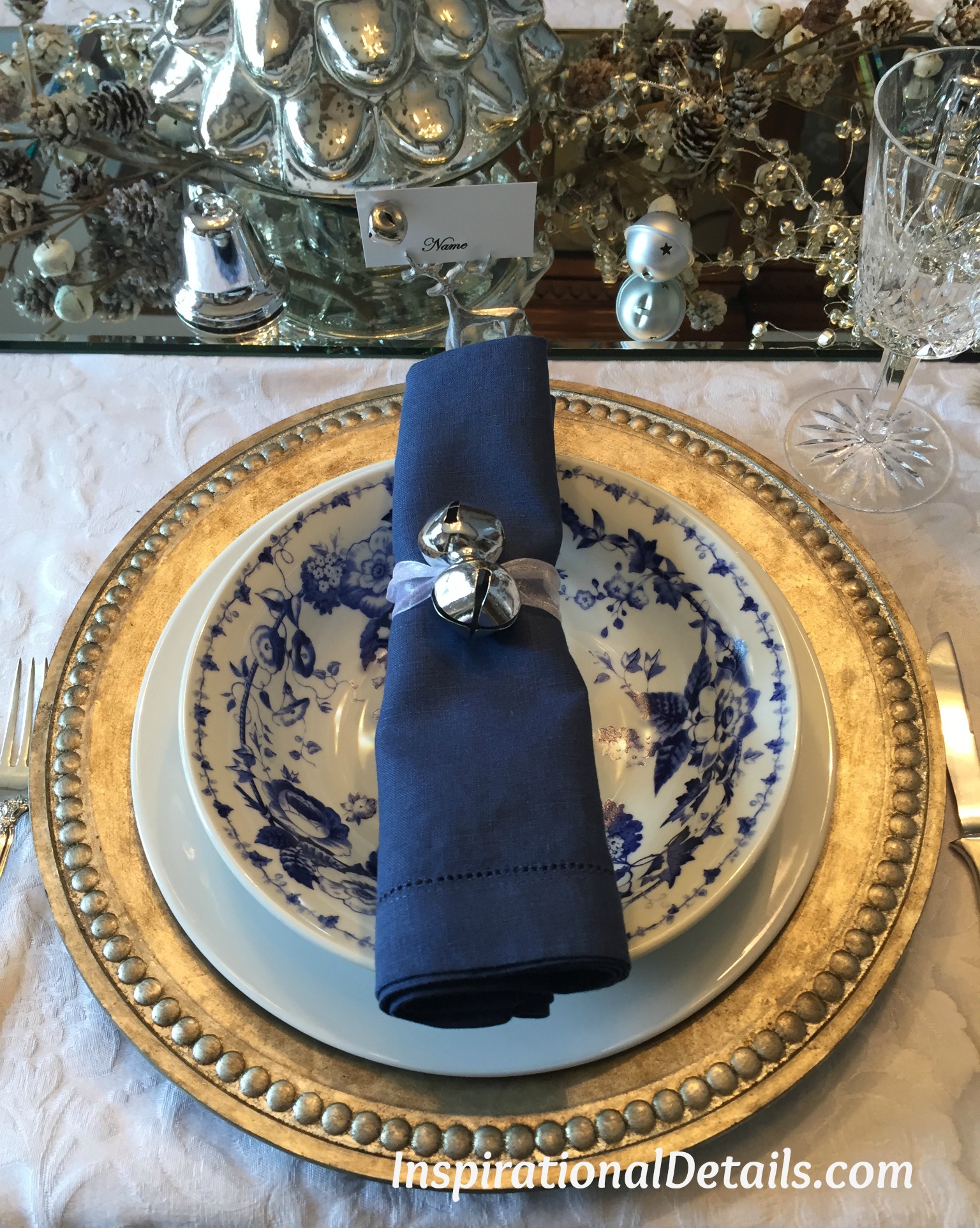 Silver chargers layered with white dinner plates and blue & white salad bowls