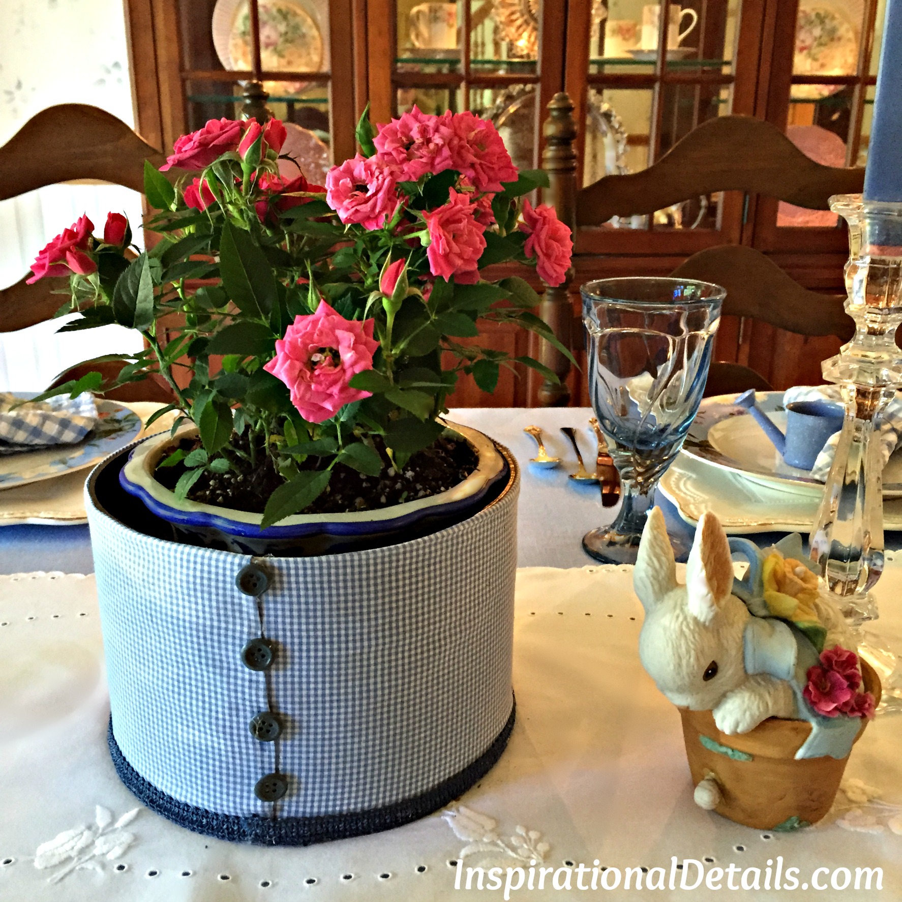 She sewed a pretty blue check fabric cover with darling buttons for her pot of mini roses…