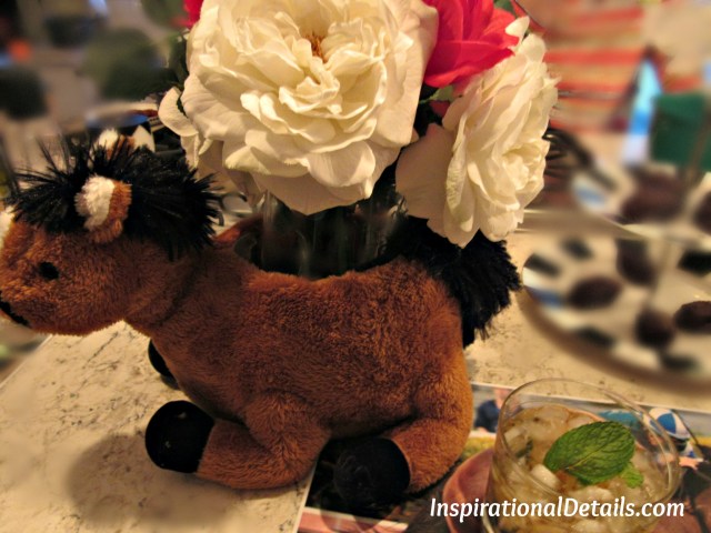 Her kitchen table, where cocktails & apps were served, was decorated with horses waiting in the paddock for the race to start…