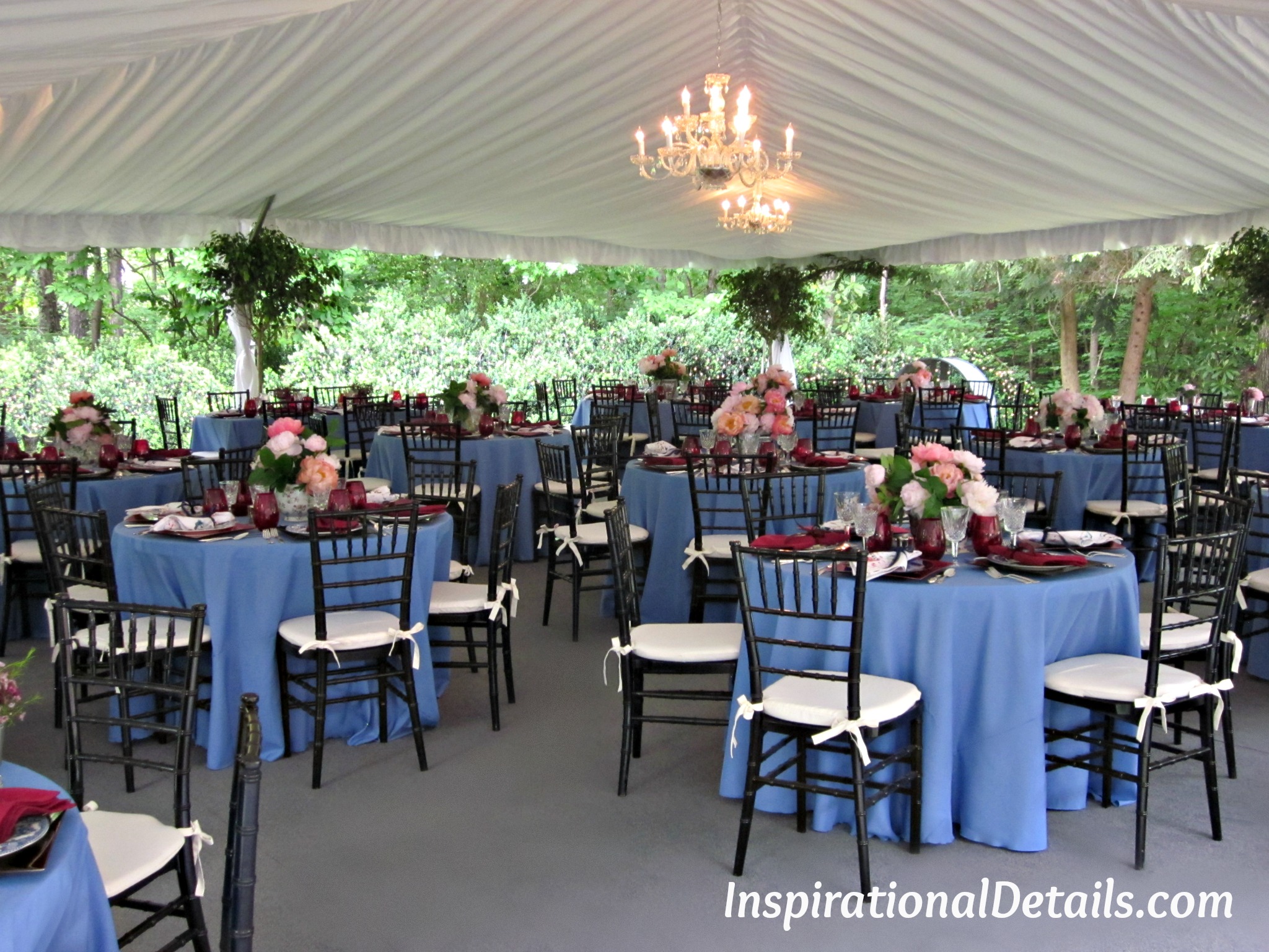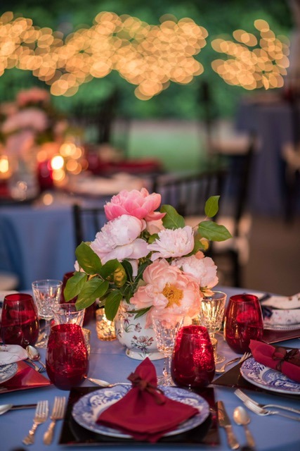 Round and rectangular tables set with blue tablecloths and blue & white plates accented with crystal wine glasses & red water glasses