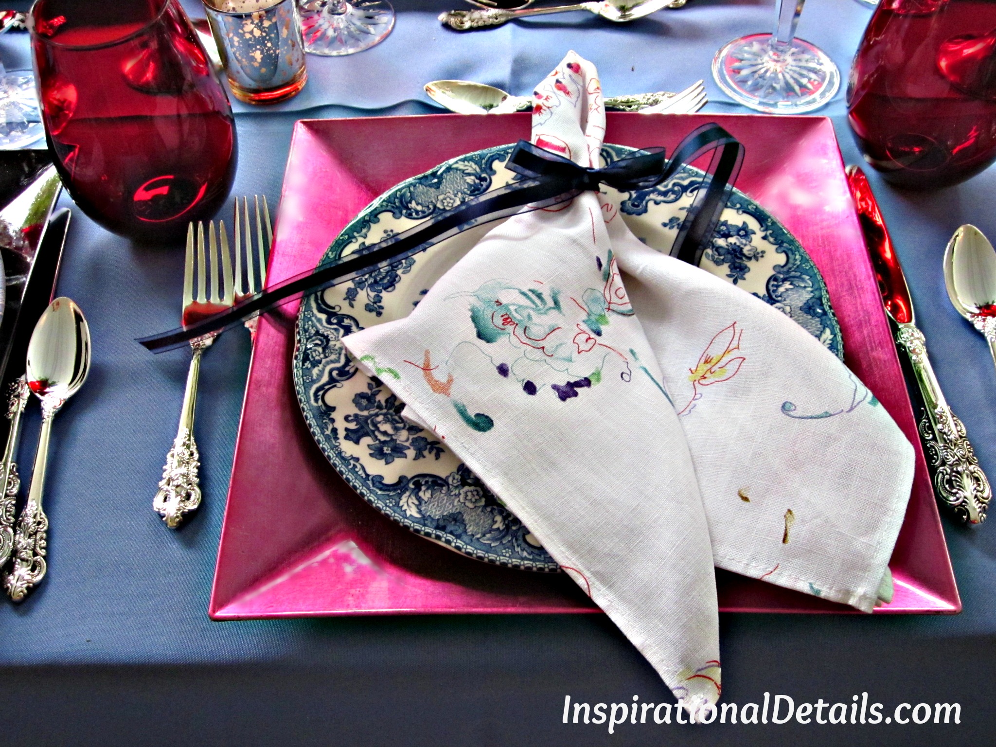 Johnson Brothers Asiatic Pheasant Blue China with Red Napkins Tied with Red Ribbon