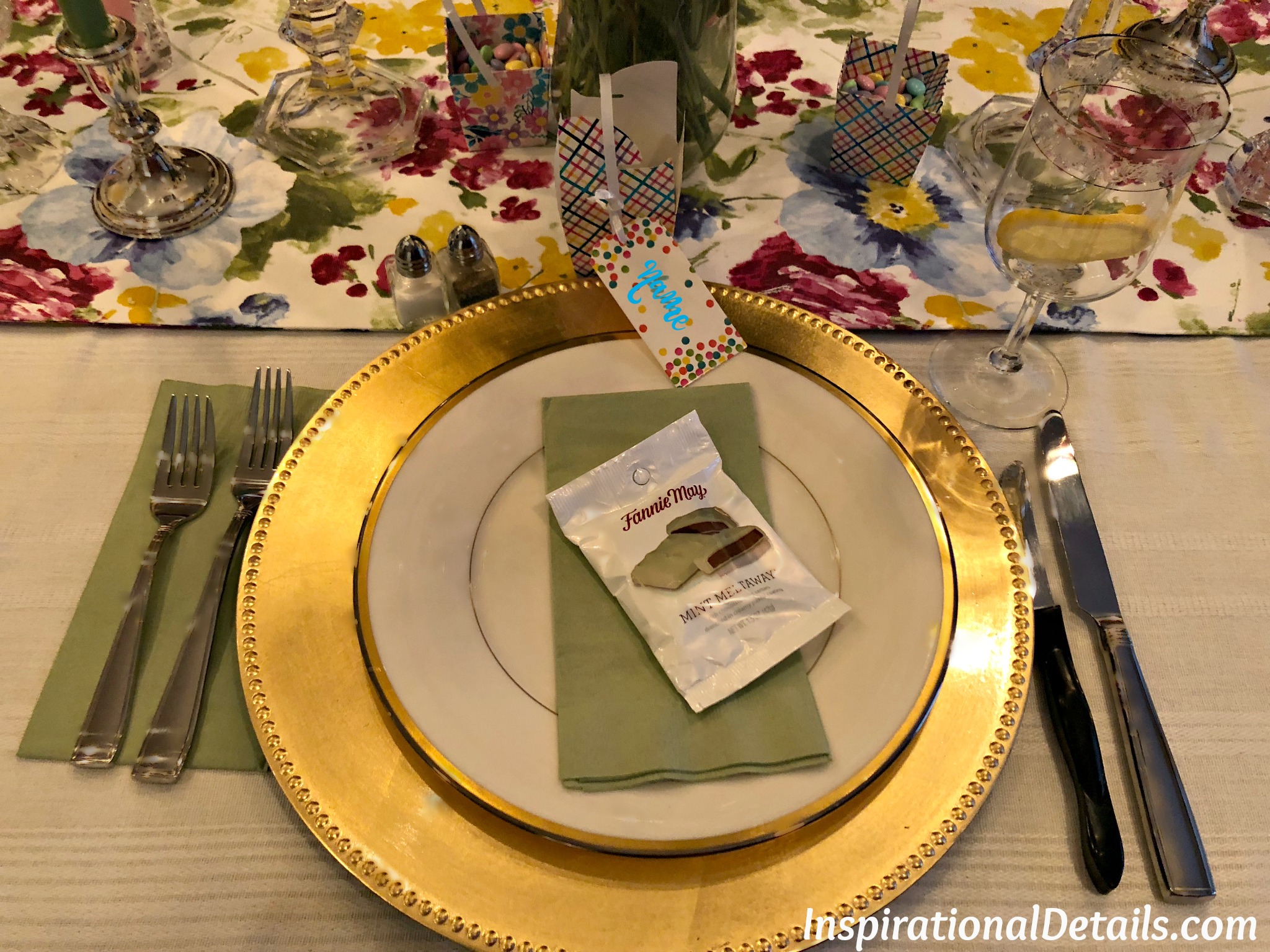 Love the different pastel colored candles paired with her flowered runner along with the spring floral centerpiece