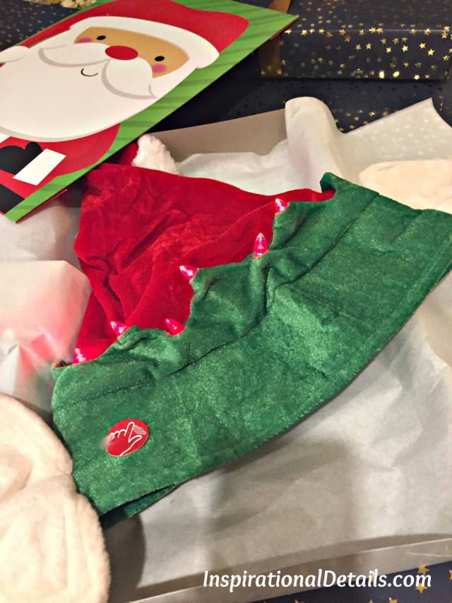 Each man received a funny “elf hat” that lit up and played a tune when a button was pushed on it. Gifts were wrapped in a starry paper.