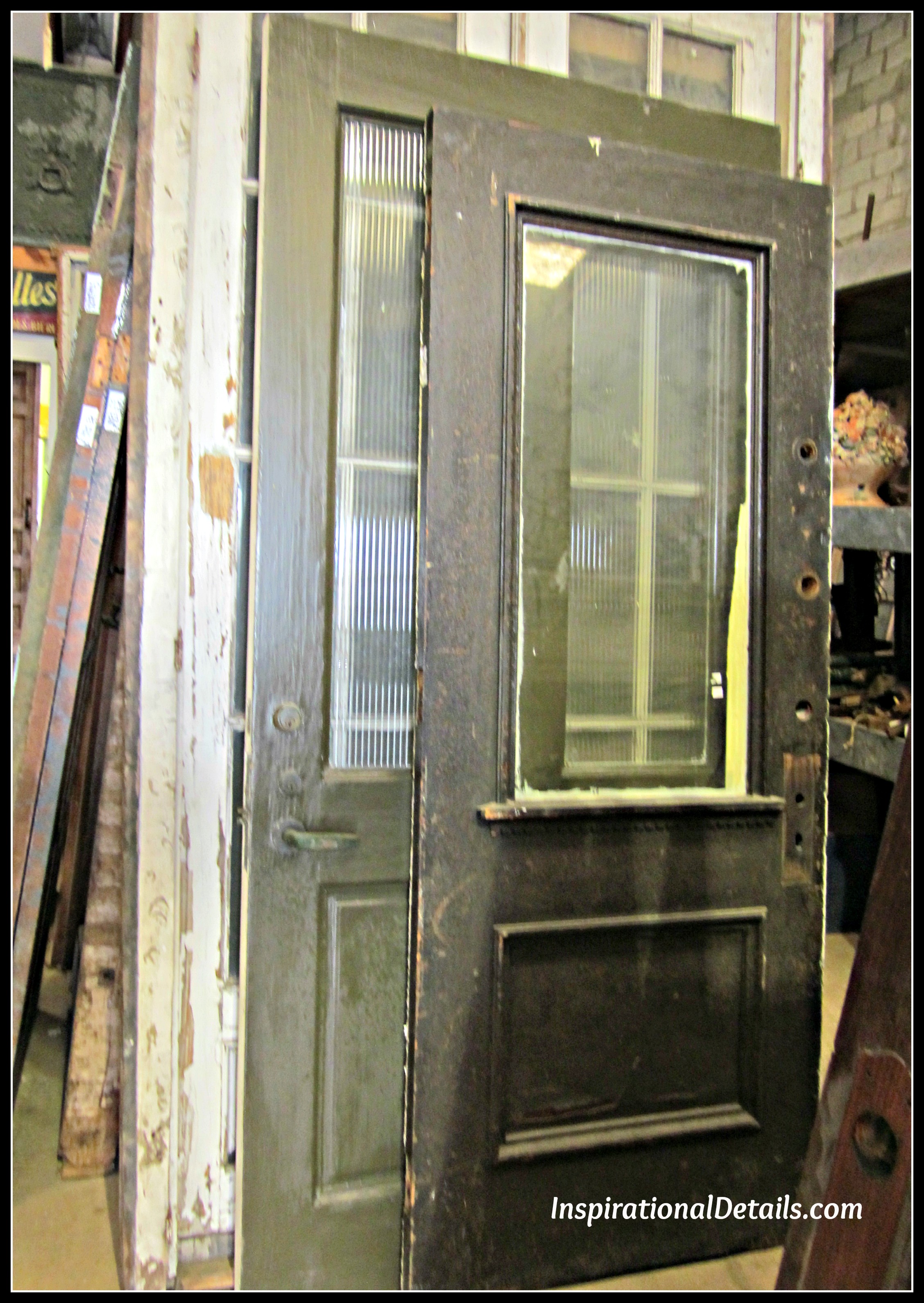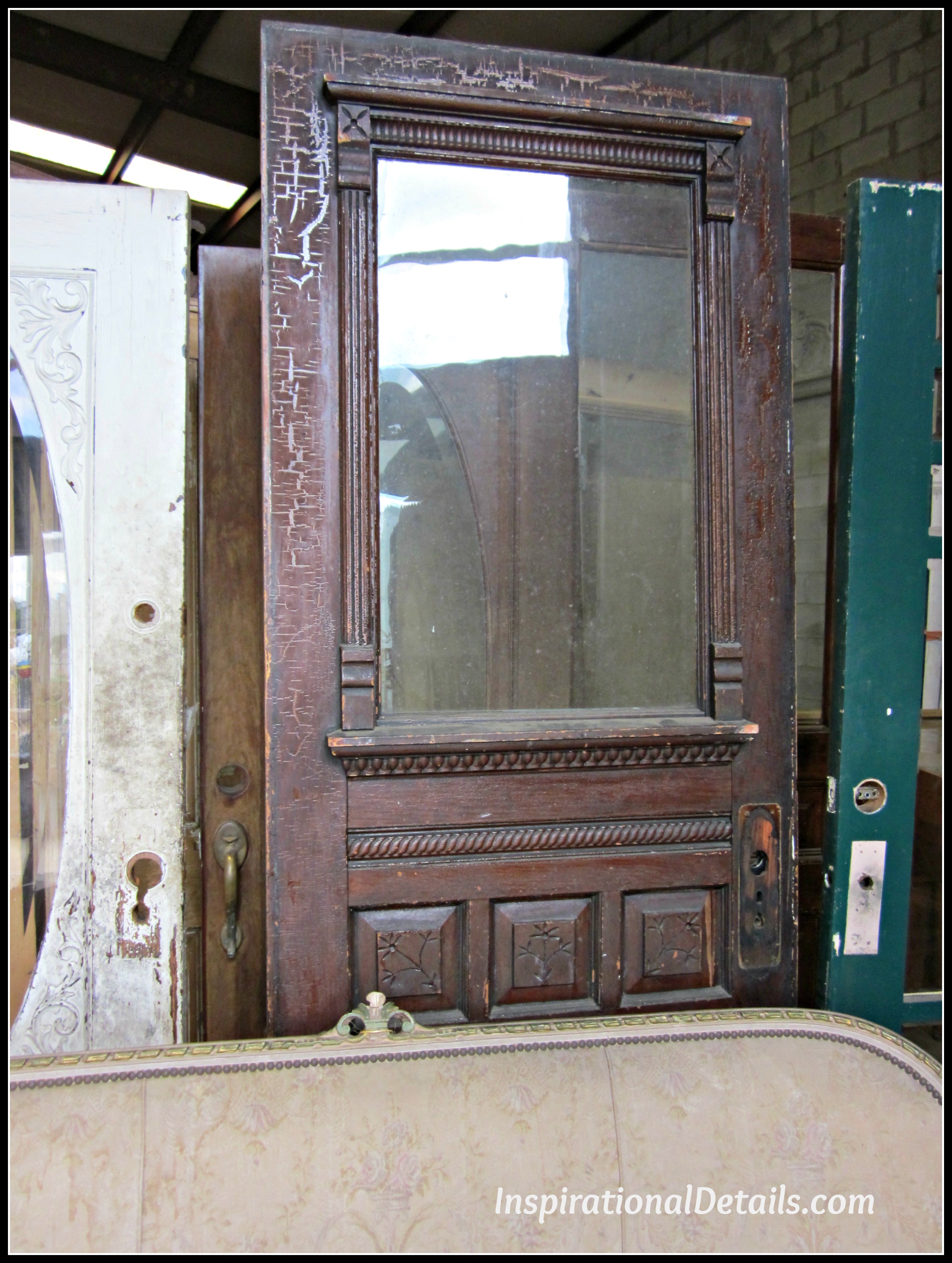When it came time in our building process to look for “my unique pantry door”, Lucia (my designer) and I started our search at a local salvage dealer, Adkins Architectural Antiques. Adkins has an extraordinary selection of older house and garden items including windows, mantels, drawer hardware, garden furniture, bathtubs, and, of course, doors. They have lots of old doors which are usually stacked up by general size.