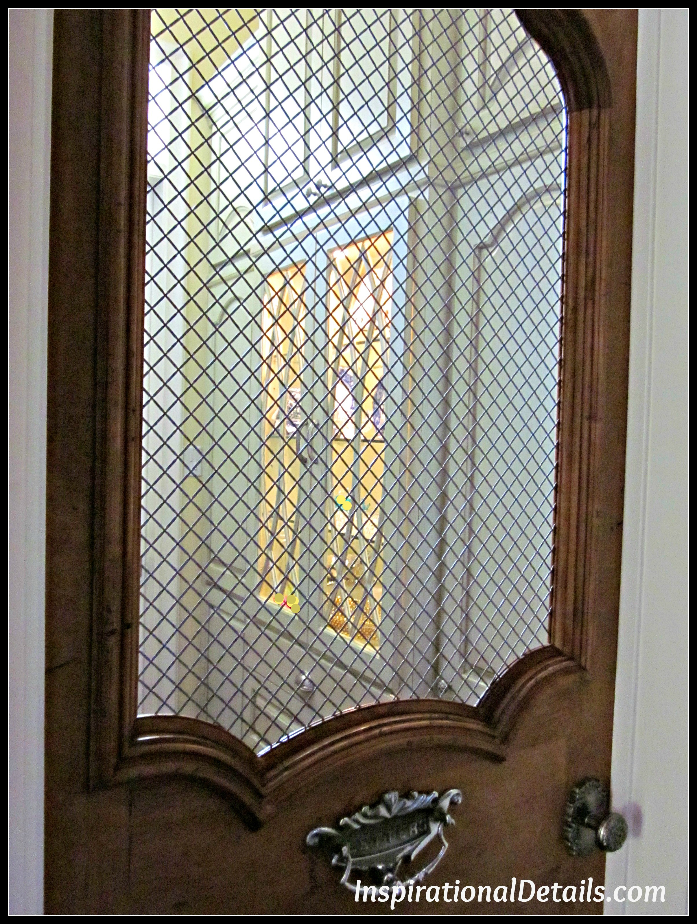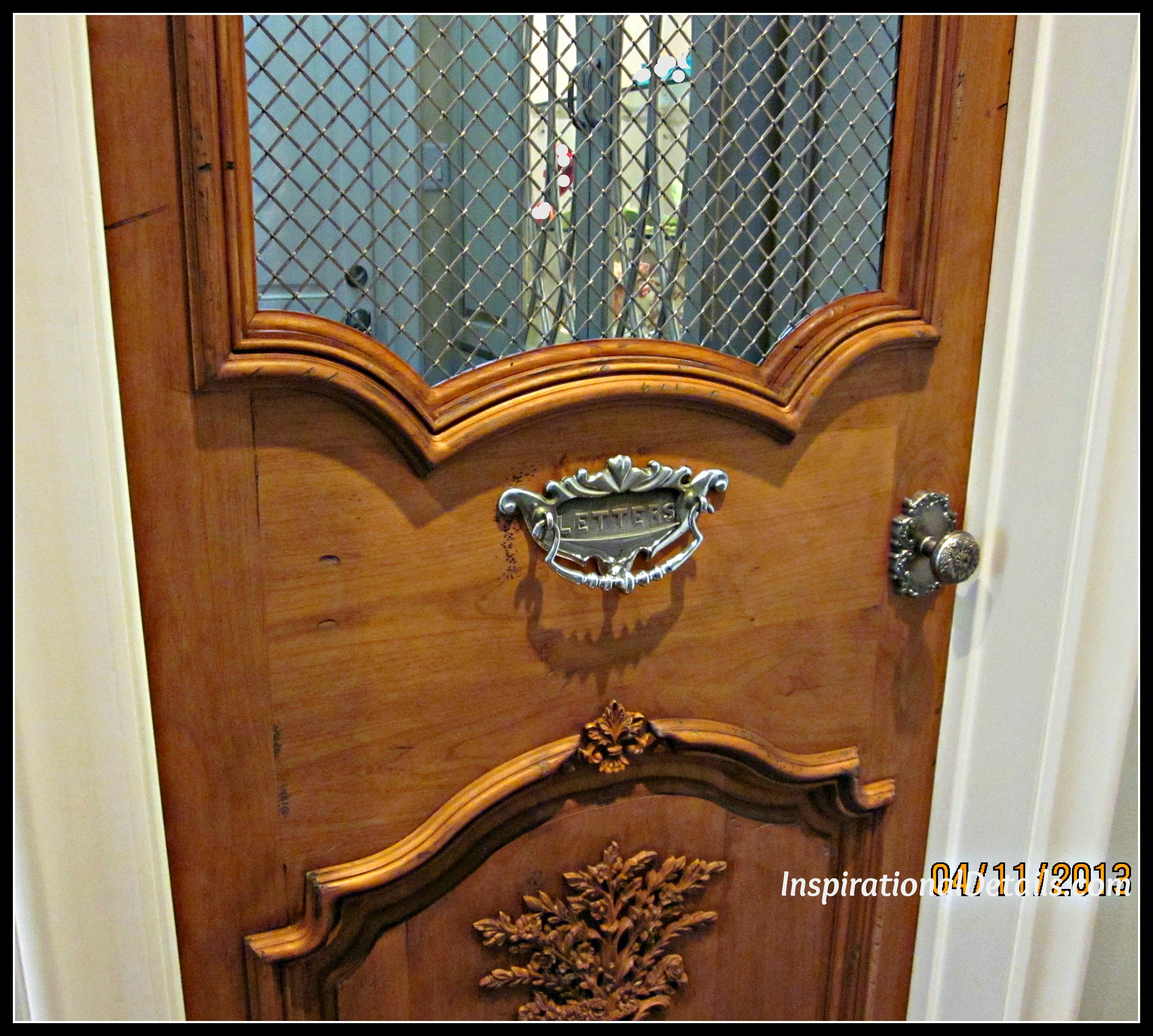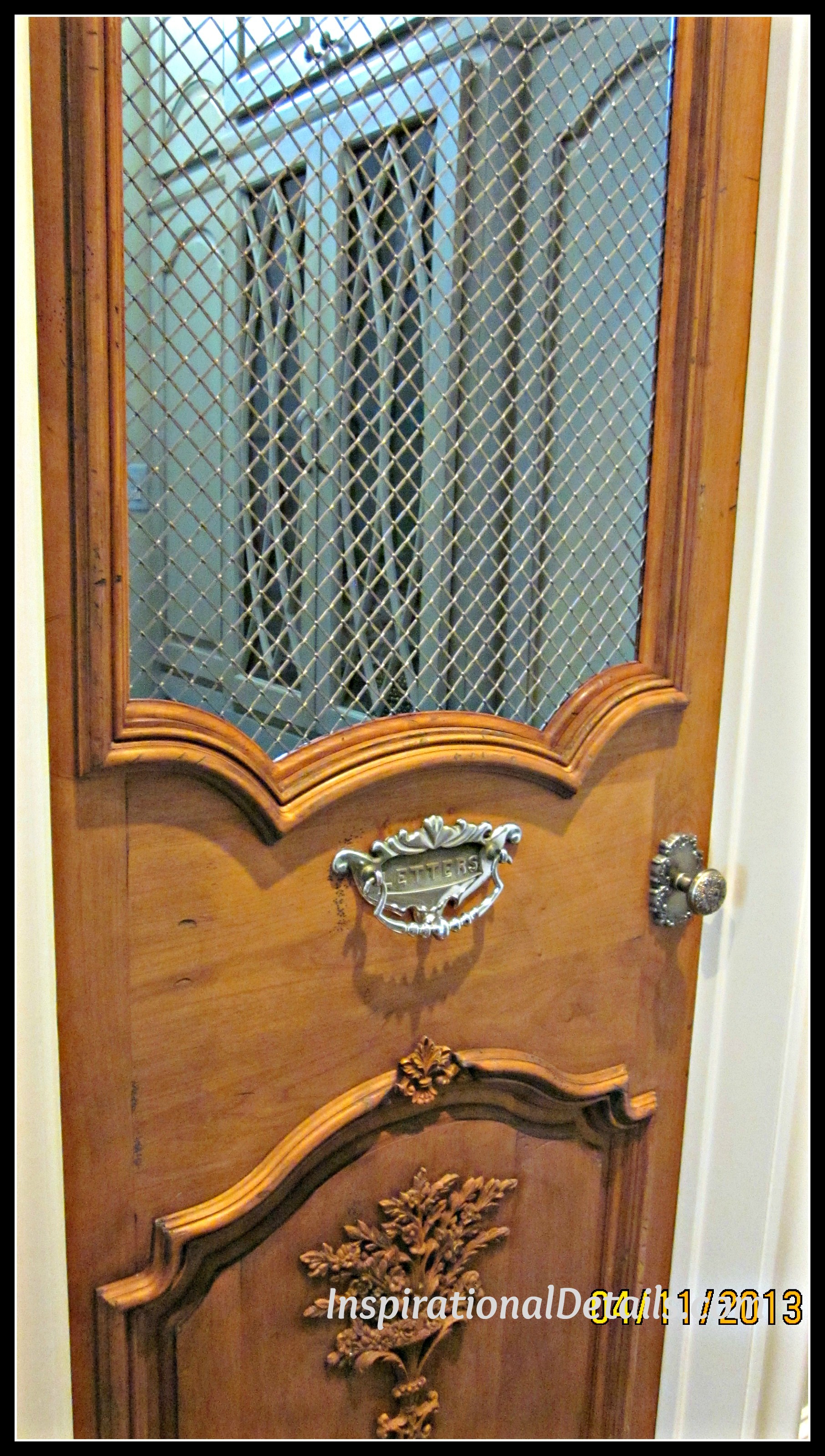 Next, Lucia and I went to a shop to select the onlays (applique millwork) for the door. We decided on using heavy chicken wire in the upper half. I searched the internet and found an antique mailbox slot I loved. Now that we had the specific sizes of the actual items that would be used on the door, Lucia was able to sketch out the door to scale.