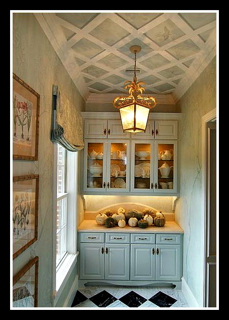 Gorgeous butler’s – love the ceiling treatment, the light fixture, and the black & white flooring…