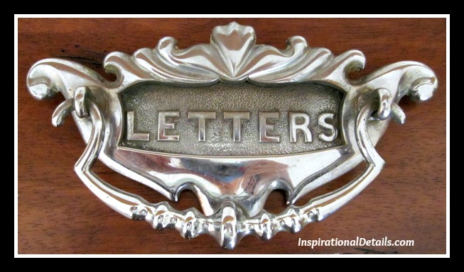 My finished door: wood stain applied, mailbox affixed, and a beautiful silver doorknob added