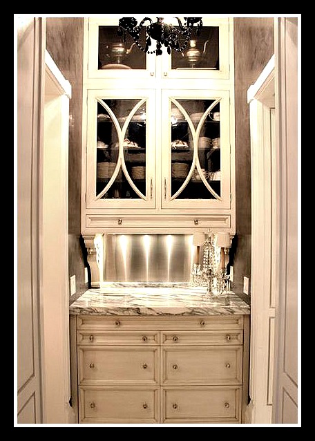 The silver-leafing on the ceiling and the walls gives this butler’s pantry a “jewel-box” effect to showcase the homeowner’s collection of items – Exquisite…